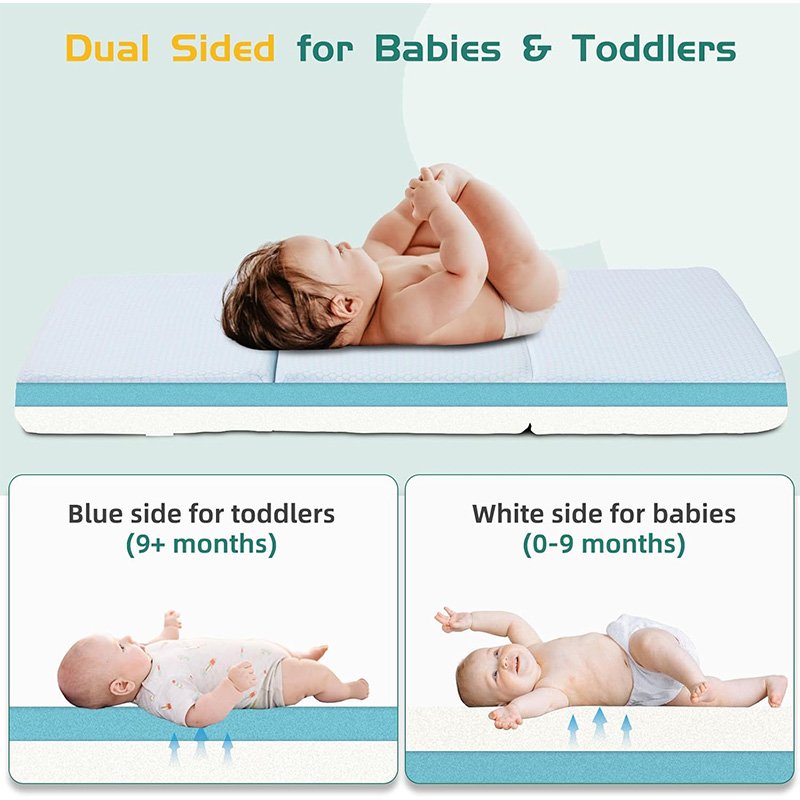 雙層雙面--鑫希陽迷你嬰兒床床墊具有雙層硬度,可為不同成長階段的寶寶提供支撐和舒適。較硬的一面由適合嬰兒的高密度支撐泡沫制成,可防止脊椎變形,促進健康成長。較軟的一側由冷卻凝膠記憶體制成,適合成長中的學步寶寶,能貼合脊椎,緩解身體壓力。